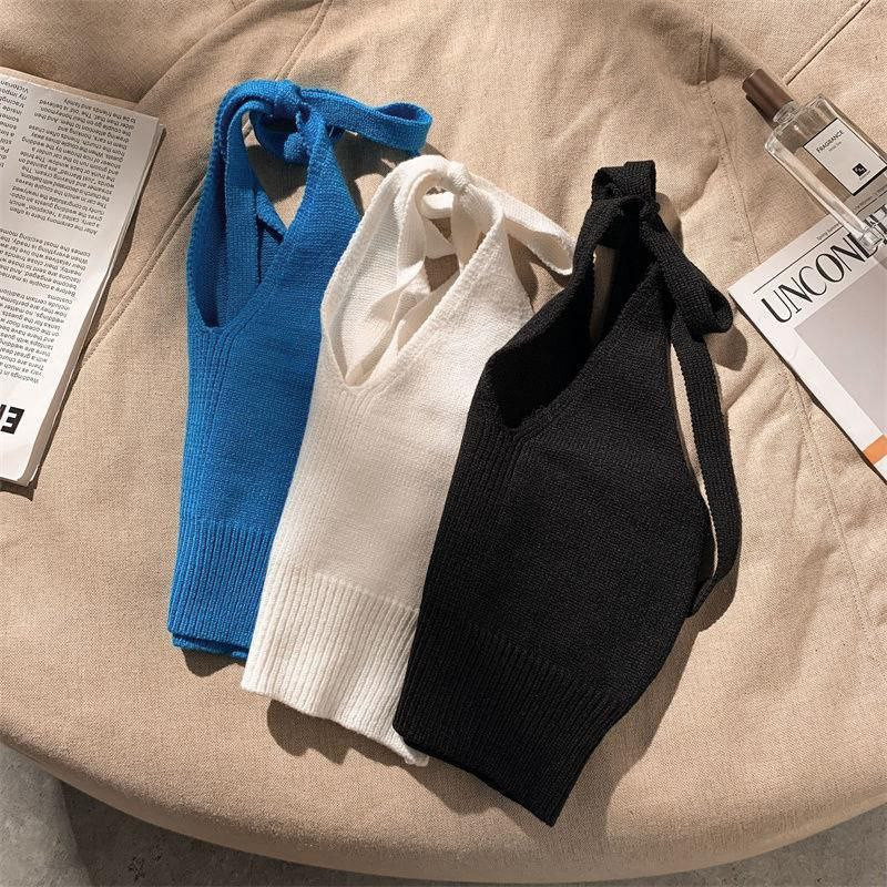 Haut tricoté à couche intérieure de niche pour femmes, bretelles à col licou, pour vêtements d'été, gilet court à bretelles blanches