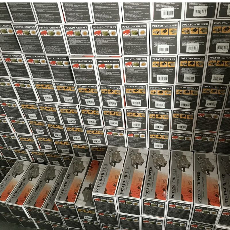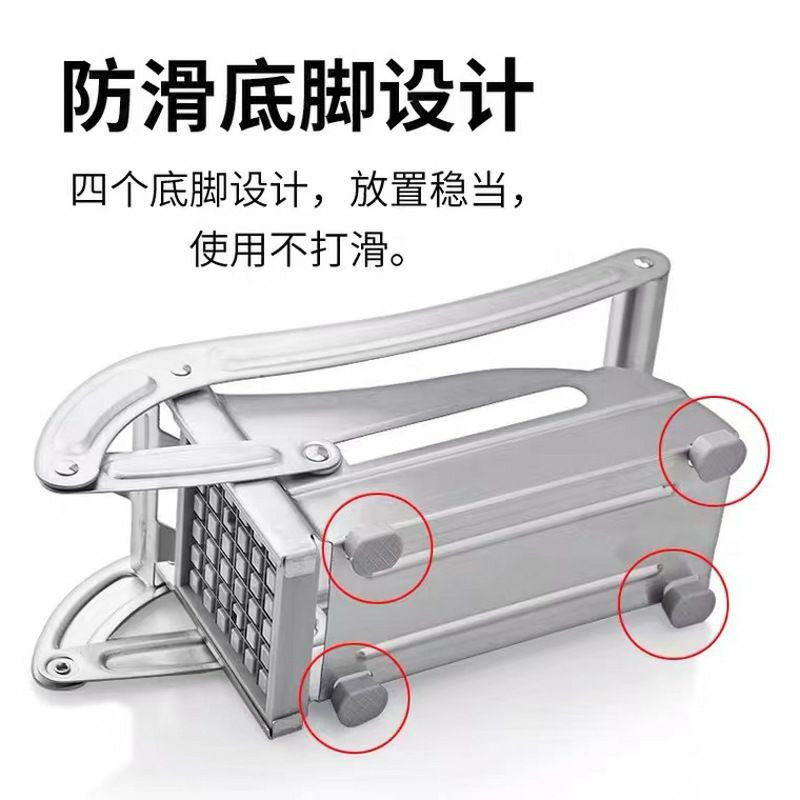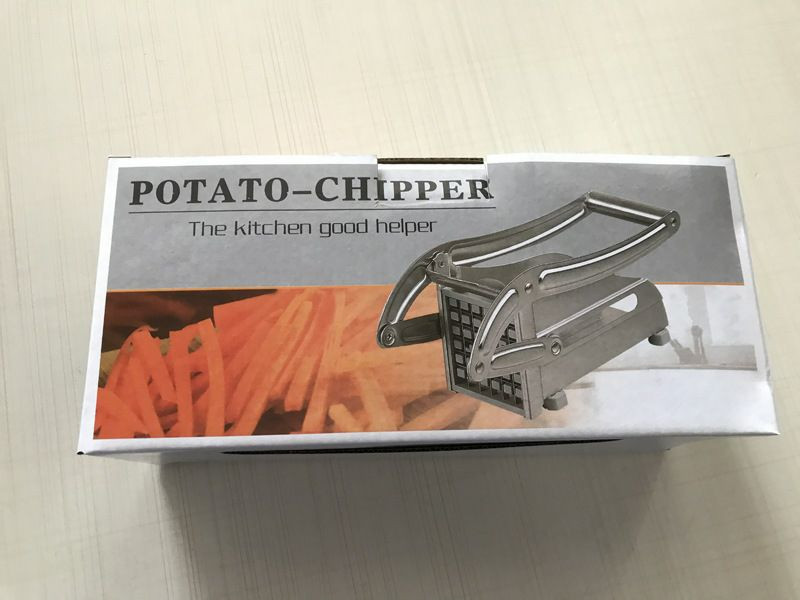 Un coupe-frites manuel, également appelé "potato chipper" en anglais, qui est un ustensile de cuisine conçu pour couper les pommes de terre et d'autres légumes en frites de manière uniforme.