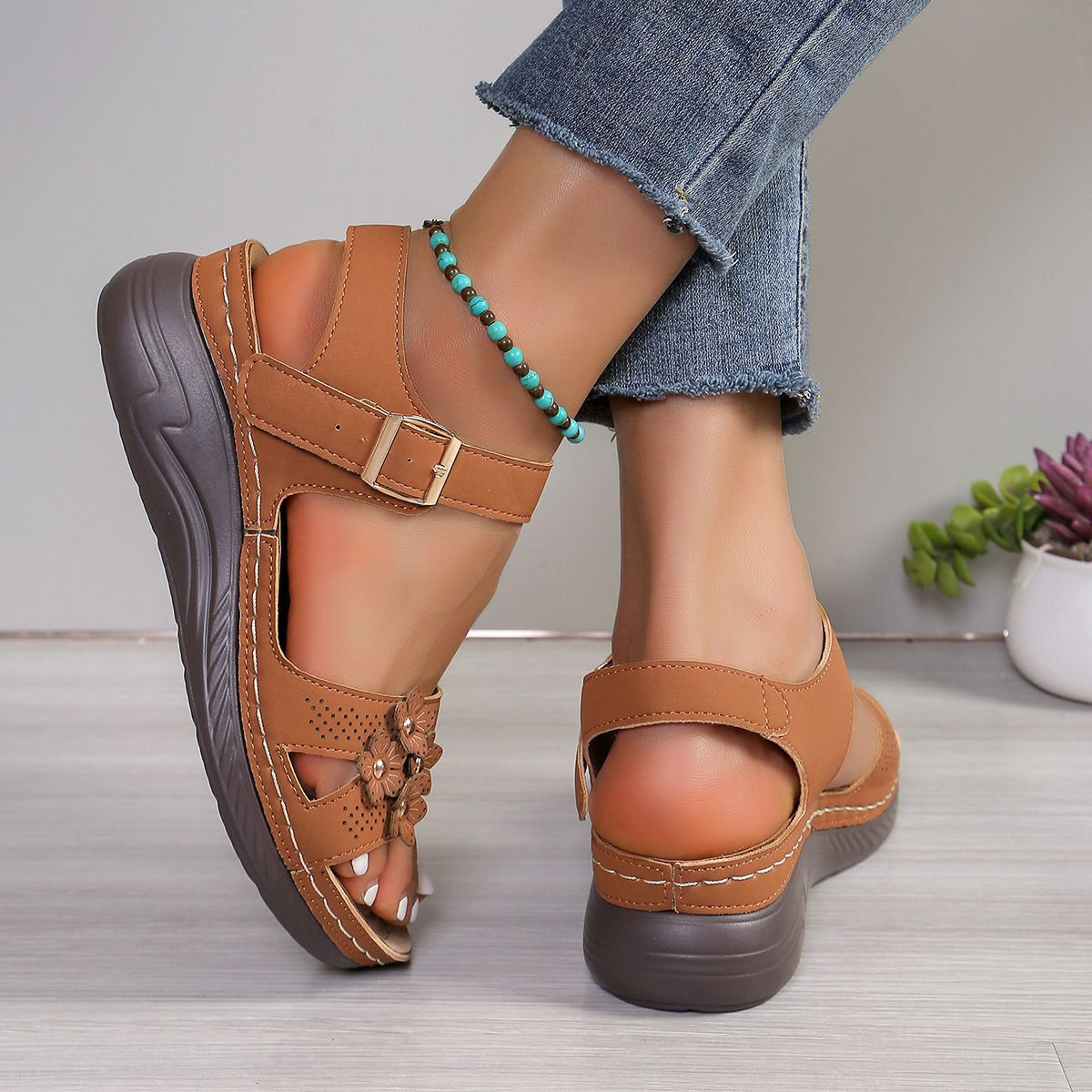 Sandales florales compensé transfrontalier grande taille un mot avec décoration florale sandales rétro pour femmes
