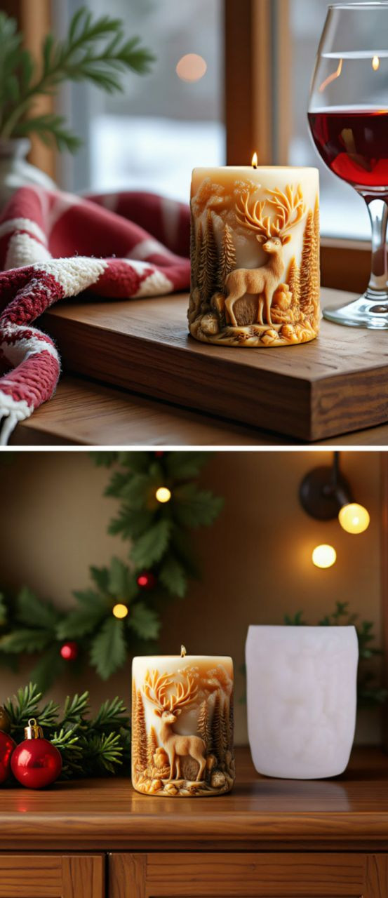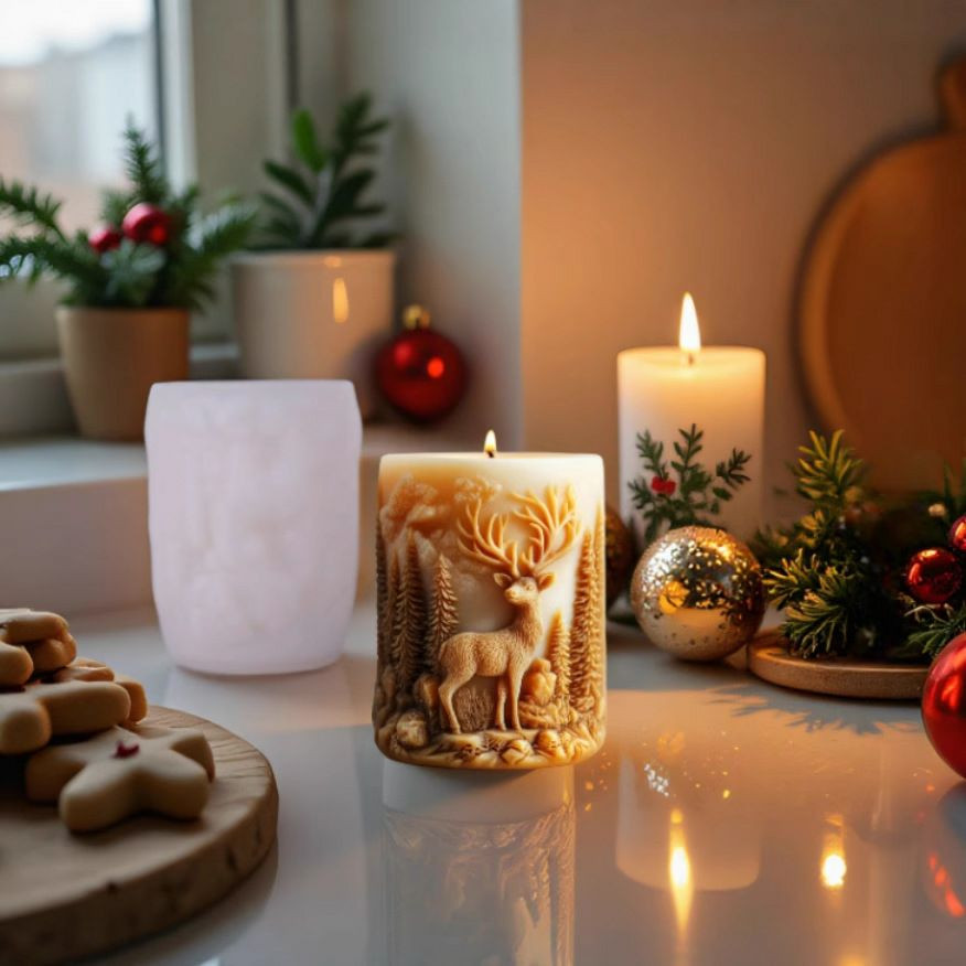 Moule en silicone pour fabriquer des bougies cylindriques sur le thème de Noël, représentant un cerf dans une forêt.